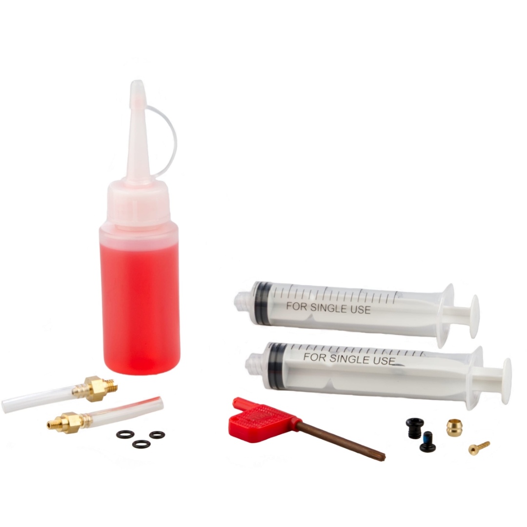 Das Set enthält alle notwendigen Teile, um den Entlüftungsvorgang schnell und problemlos durchführen zu können. Es enthält unter anderem ein Entlüftungsset mit einer speziellen Spritze, Schläuchen und Adaptern, die perfekt auf die Bremsleitungen Ihres E-Bikes passen. Wir empfehlen immer Bremsflüssigkeit DOT 5.1 .
