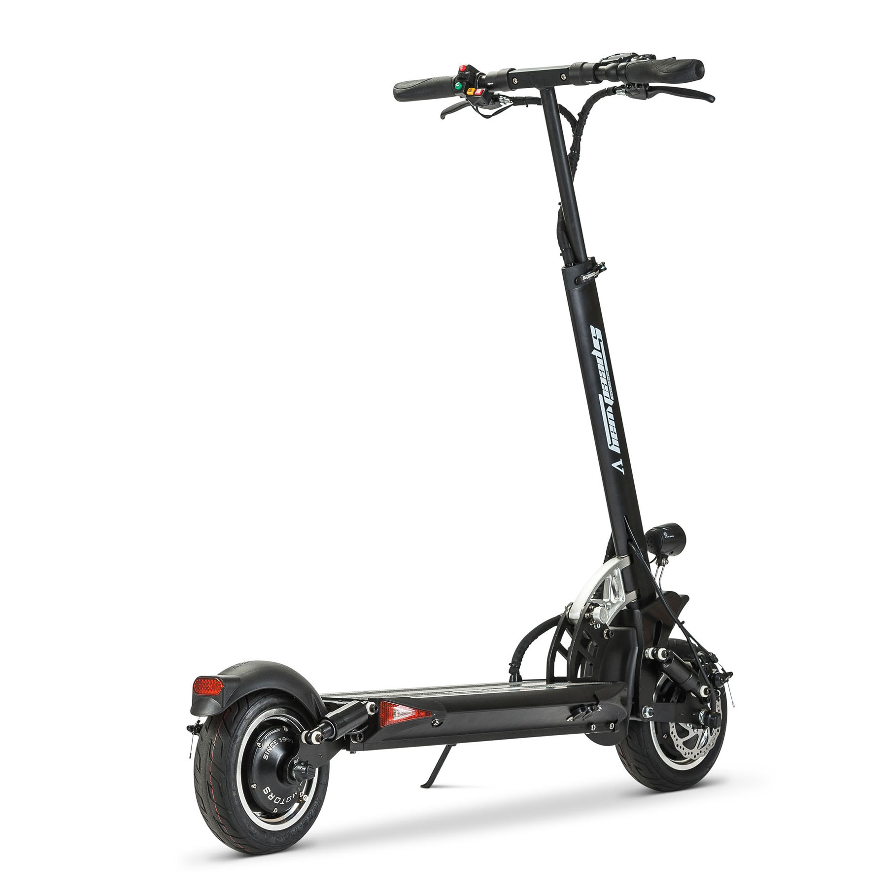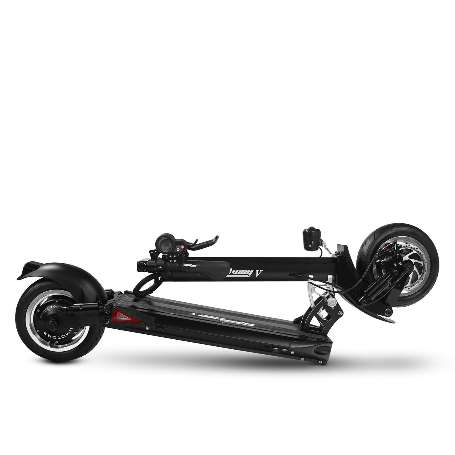 Die Kombination aus Front- und Hinterradfederung sorgt für ein angenehmes Fahrgefühl, selbst auf unebenen Straßen oder hügeligem Gelände. Die langlebigen 10-Zoll-Tubeless-Reifen bieten zusätzlichen Grip und Stabilität. Mit einer Reichweite von bis zu 60 km (Doppelmotor-Version) ist der Speedway 5 auch für längere Fahrten bestens gerüstet. Zudem überzeugt der Scooter durch ein sicheres Bremssystem mit Scheiben- und Magnetbremsen vorne und hinten.